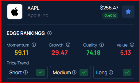 Benzinga’s Edge Rankings place Apple in the 74th percentile for quality and the 59th percentile for momentum, reflecting mixed performance. Check the detailed report here