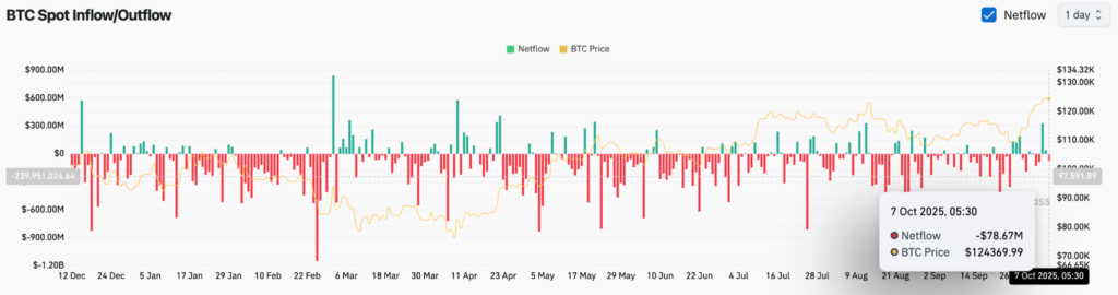 Exchange netflows for Oct. 7 showed a negative balance of about $78 million, according to Coinglass, suggesting holders are pulling coins off exchanges.
