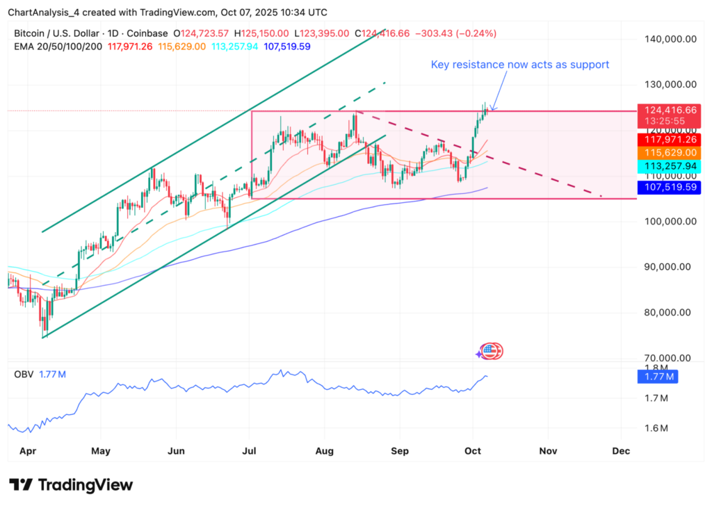 Technical Analysis: Bitcoin broke decisively above the $120,000–$124,000 ceiling, flipping a key resistance into support.