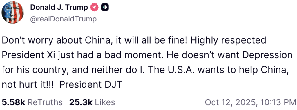 Trump posted on Truth Social on Sunday, saying, “Don’t worry about China, it will all be fine,” adding that the “Highly respected President Xi just had a bad moment,” hinting at de-escalation.